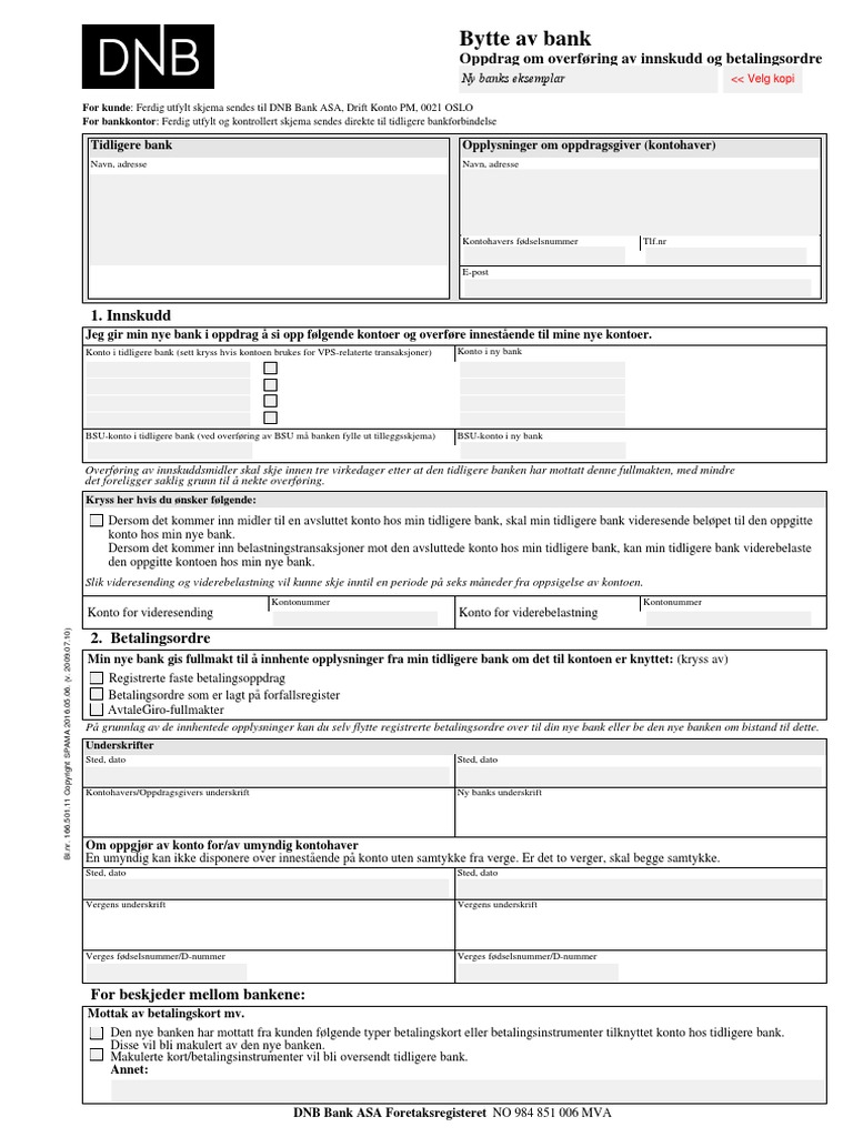 Elektronisk innsending av fondsblanketter. Overføring av delbeløp fra en konto i eksisterende Bank til ny konto i annen Bank. Her finner du fullmakter til Kartverket UDI og NAV samt generelle fullmakter prosessfullmakter og fremtidsfullmakt.