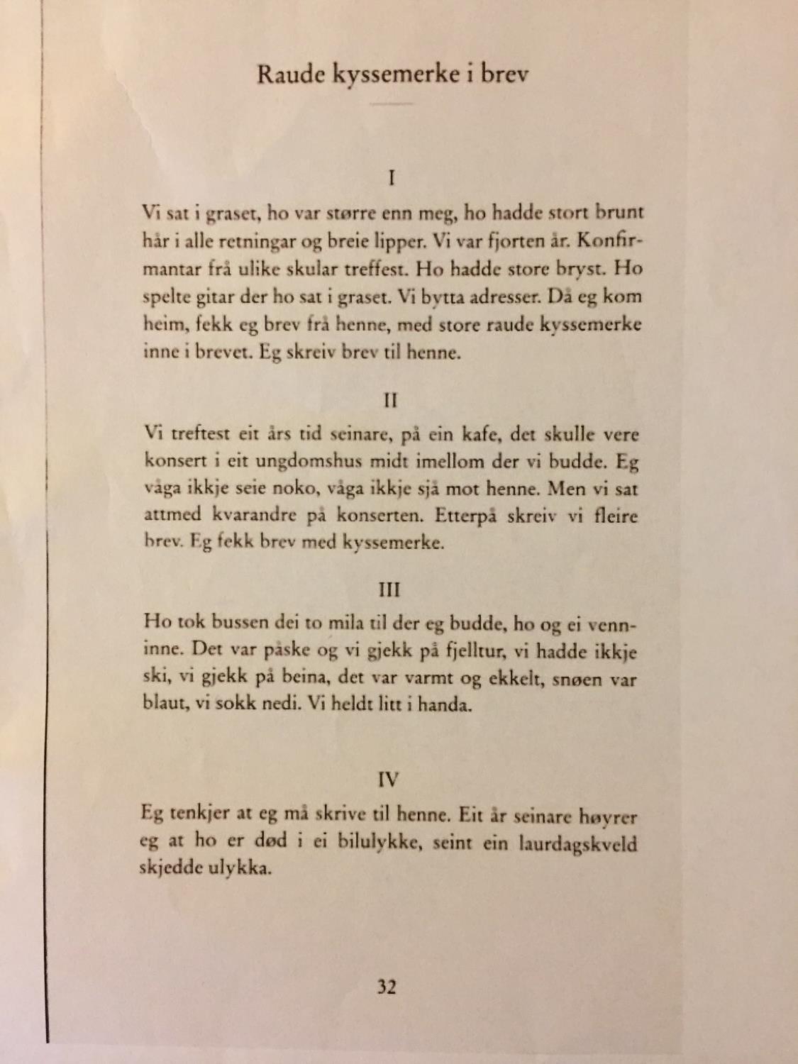 Novella Raude kyssemerke i brev av Jon Fosse er valt fordi det er ein kort tekst med eit enkelt språk og tydelege sjangertrekk16 I tillegg er novella. I tillegg er novella utfordrande for ungdommar som ofte blir fôra med litteratur og film med den tradisjonelle lukkelege slutten. Raude kyssemerke i brev 711 Lindstrøm Merethe Hunden 712 Kronologisk fortegnelse over tekstene 715 Alfabetisk forfatterliste 718.